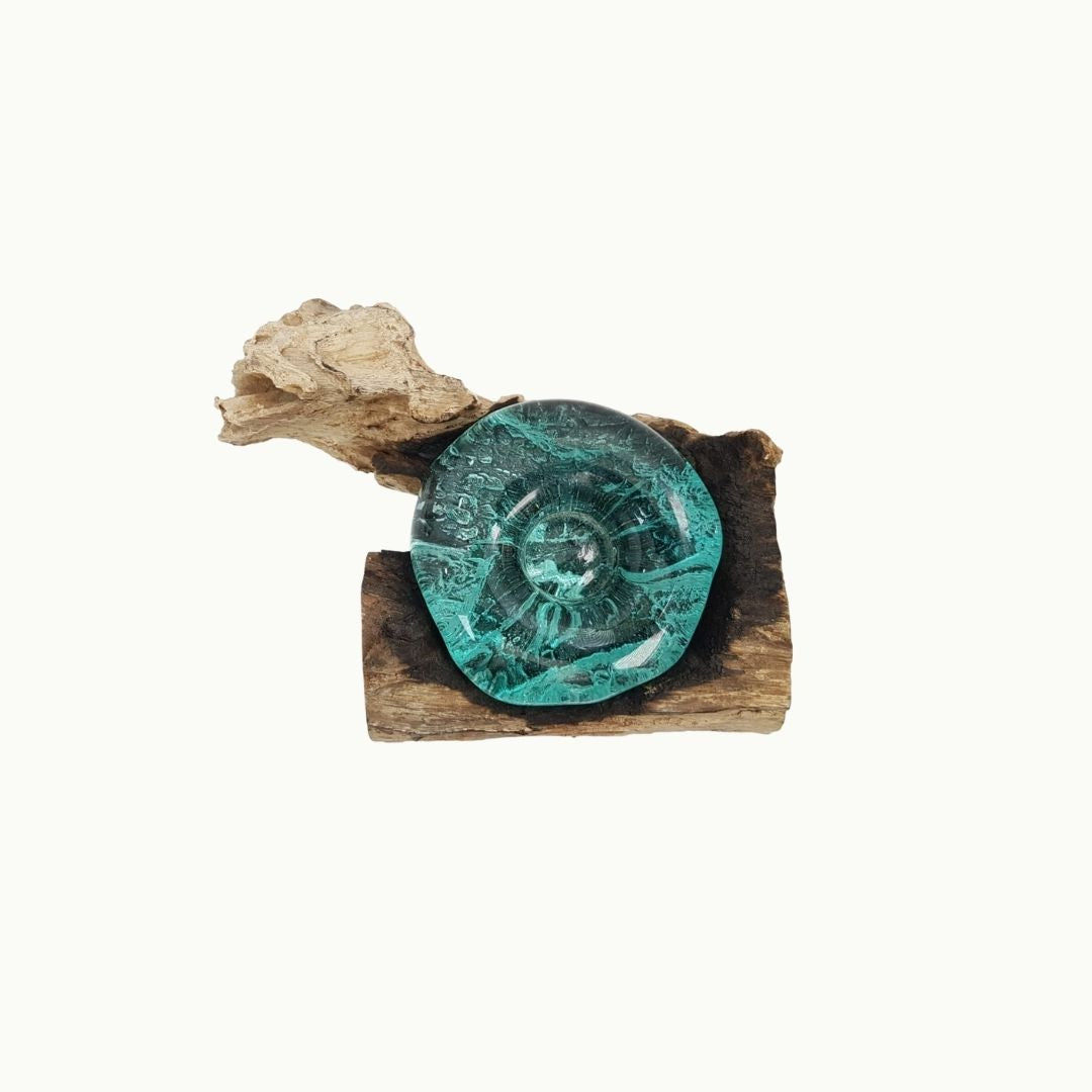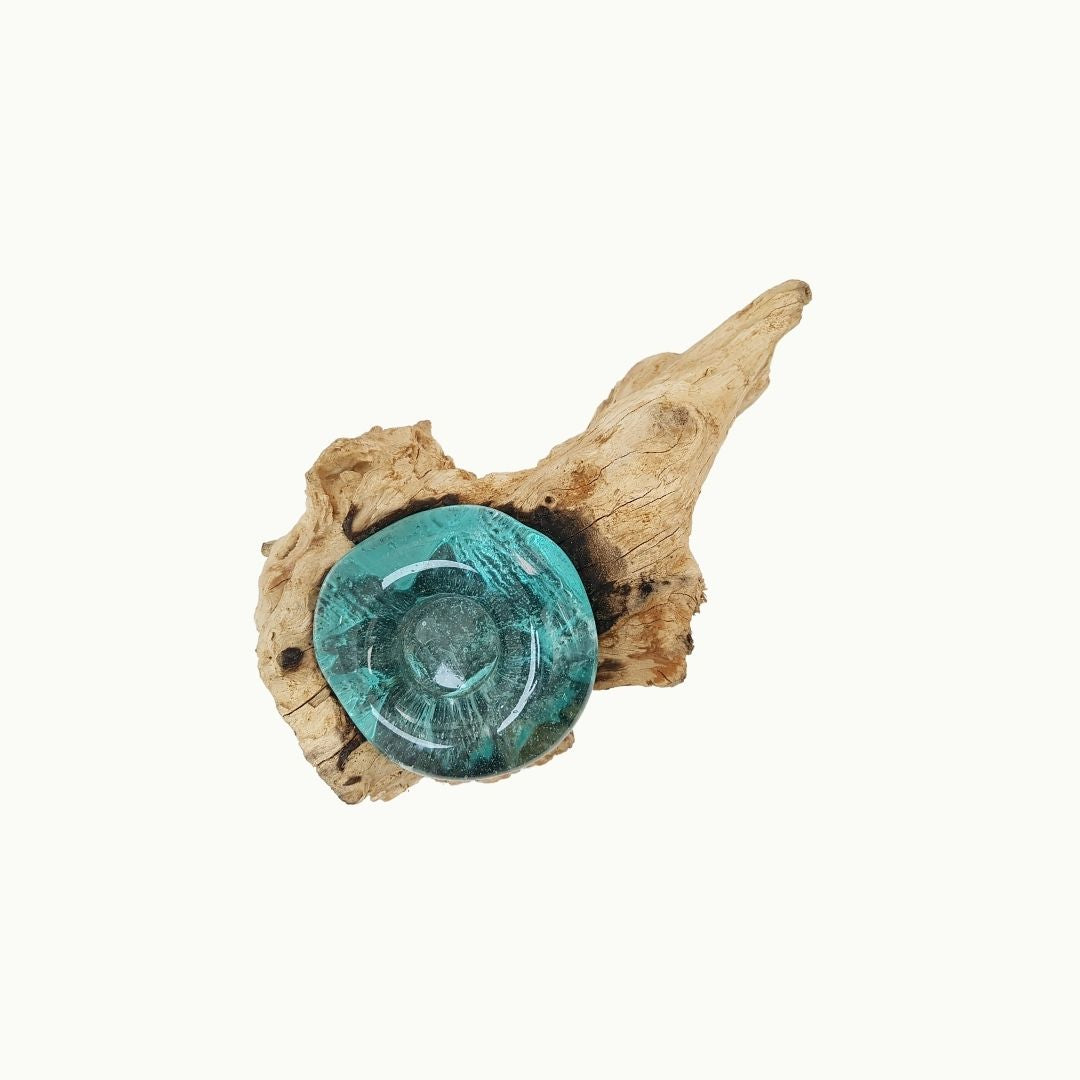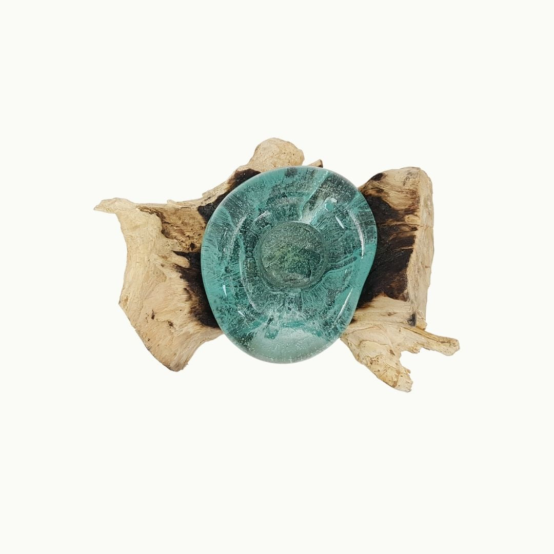 Cenicero de vidrio soplado y madera natural